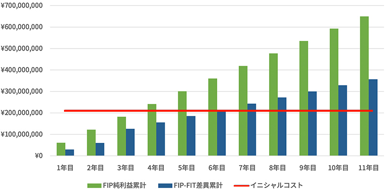 本図は、FIP転換に伴う初期費用(イニシャルコスト)に対して、FIP転換後に得られる純利益およびFIPとFITの収益差額の累計をもとに、初期費用を回収するまでの年数を示したシミュレーションです。