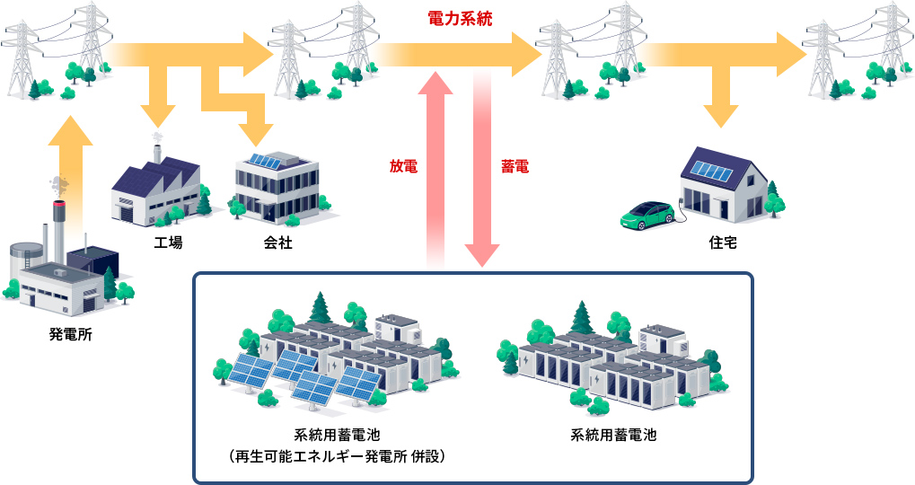 系統用蓄電池は、広域的な需給調整の一部として活用されます。