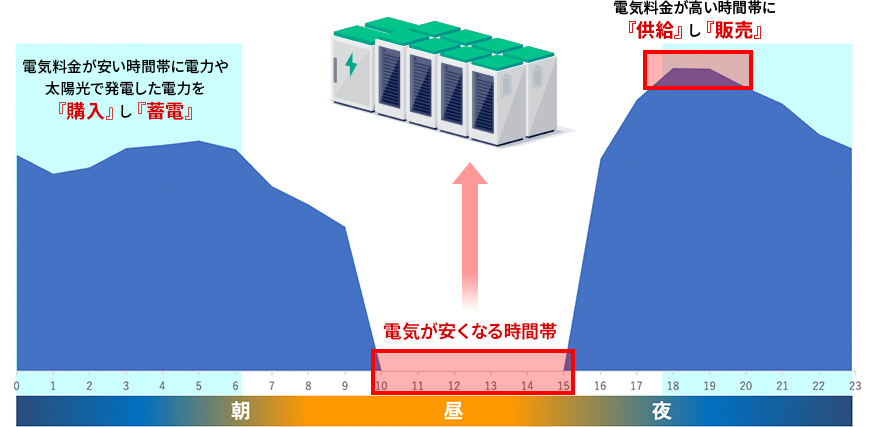 電力価格が安い時間帯に市場から電力を購入し、蓄電池に充電。電力需要が高まり価格が上昇する夜間帯などに放電・売電することで、取引電力量と市場価格の差を収益として得ます。