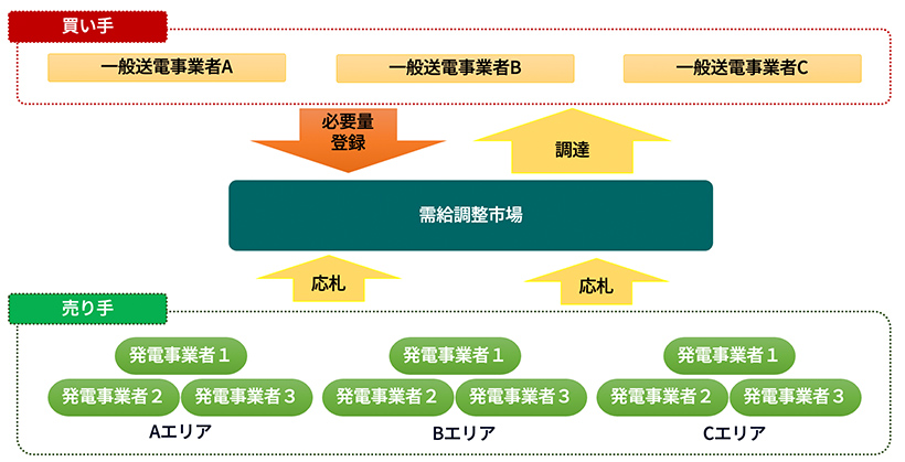 一般送配電事業者は、エリアを超えた広域的な市場から必要な調整力を調達し、電力系統の安定運用を図ります。