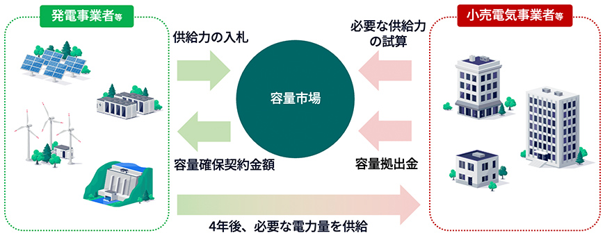 容量市場では、このような将来の供給力をあらかじめ確保する仕組みが整えられています。
