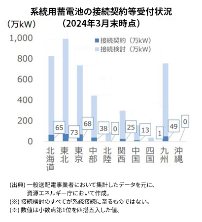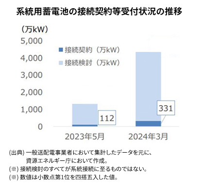 系統用蓄電池の接続検討・接続契約の受付状況を見ると、接続検討受付は約4,000万kW、契約申込みは約330万kWに達しています。