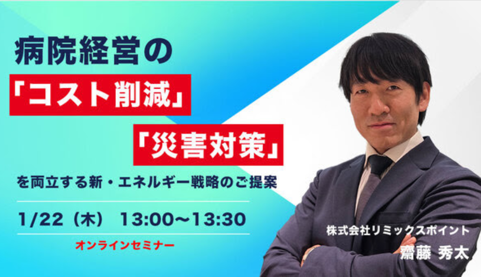当社は、ユカリアグループのゼロメディカル社と共同で、1月22日(木)に、病院経営における電力利用の最適化を解説するオンラインセミナーを開催いたします。